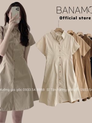 Đầm váy nữ basic Banamo fashion cổ sơ mi cài cúc chiết eo lưng chun cộc tay nhiều màu 5915