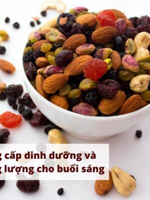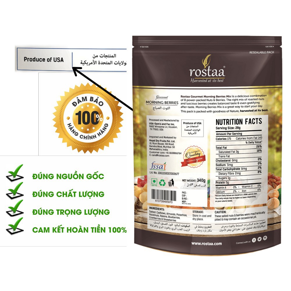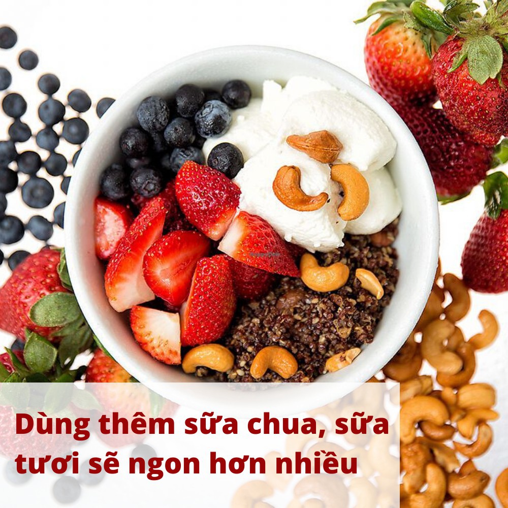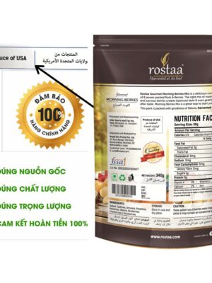 – Thành phần: Hạt điều, hạnh nhân, hồ trăn rang, nho khô, mâm xôi, việt quất, dâu tây, nam việt quất sấy khô.