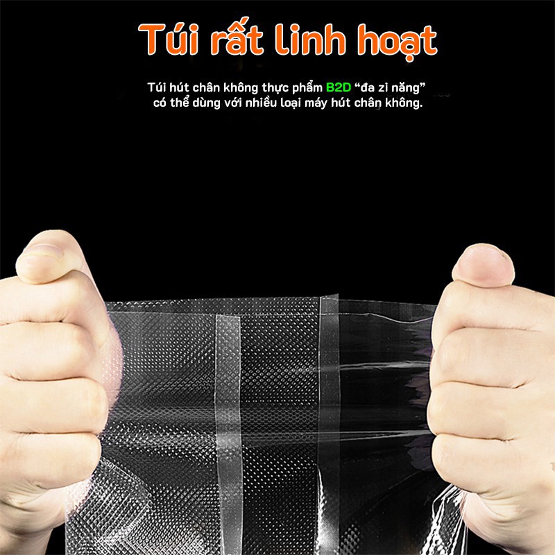 Túi hút chân không thực phẩm B2D “đa zi năng” có thể dùng với nhiều loại máy hút chân không. Không chứa chất gây ung thư. Đạt tiêu chuẩn chất lượng an toàn thực phẩm. Phân phối với giá buôn, rẻ nhất trên thị trường.