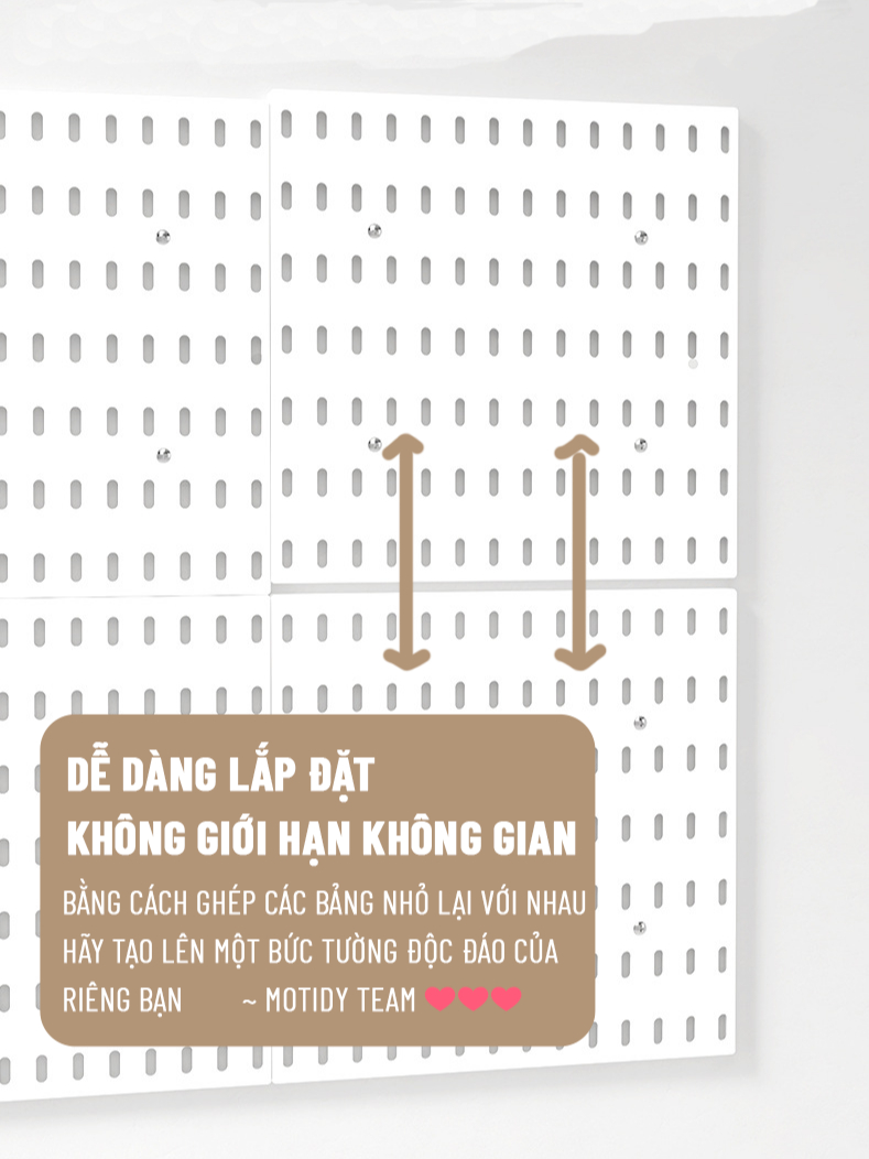 Từ các móc treo nhỏ để bạn có thể móc chìa khóa, ô dù, các dụng cụ cơ khí đến các vật dụng to lớn hơn như cây lau nhà, máy hút bụi cầm tay … tất cả đều có thể lưu trữ thông minh với bảng pegboard Chúng tôi cung cấp hai giải pháp gắn tường