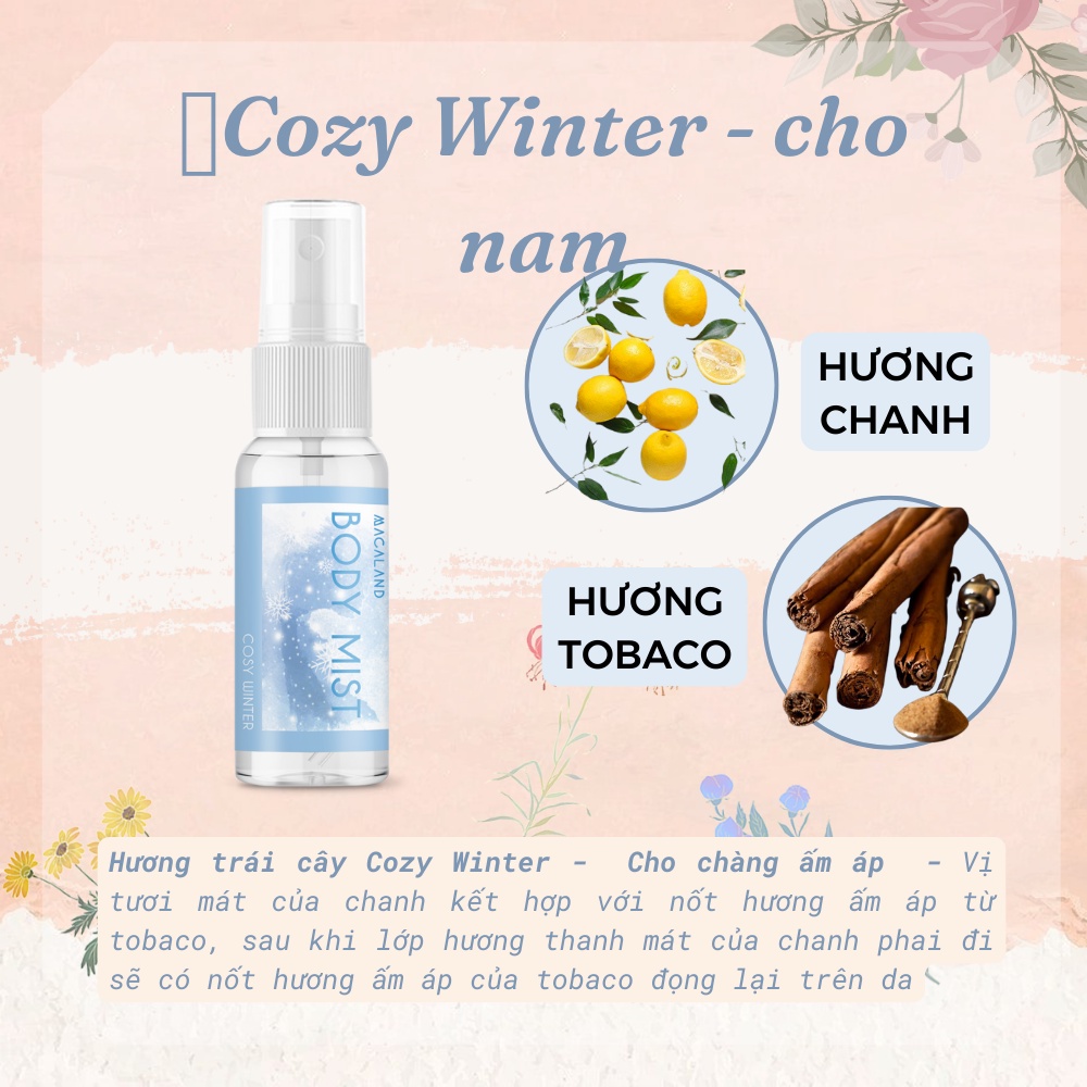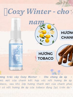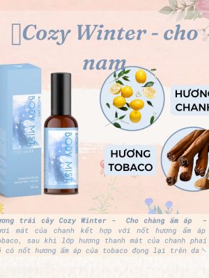 🌸 Hương trái cây Cozy Winter: Dành cho những chàng trai thanh lịch, trưởng thành. Vị tươi mát của chanh kết hợp với nốt hương ấm áp từ tobaco, sau khi lớp hương thanh mát của chanh phai đi sẽ có nốt hương ấm áp của tobaco đọng lại trên da