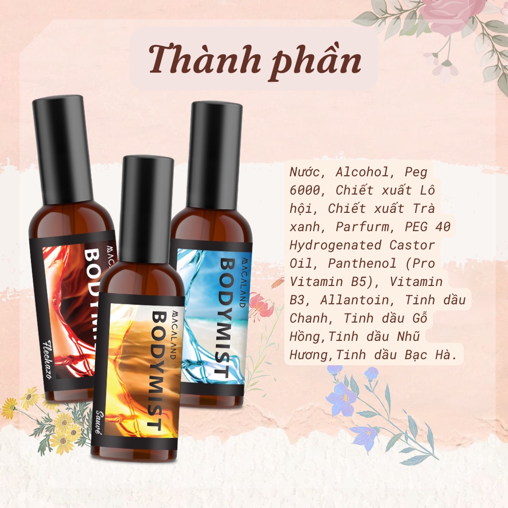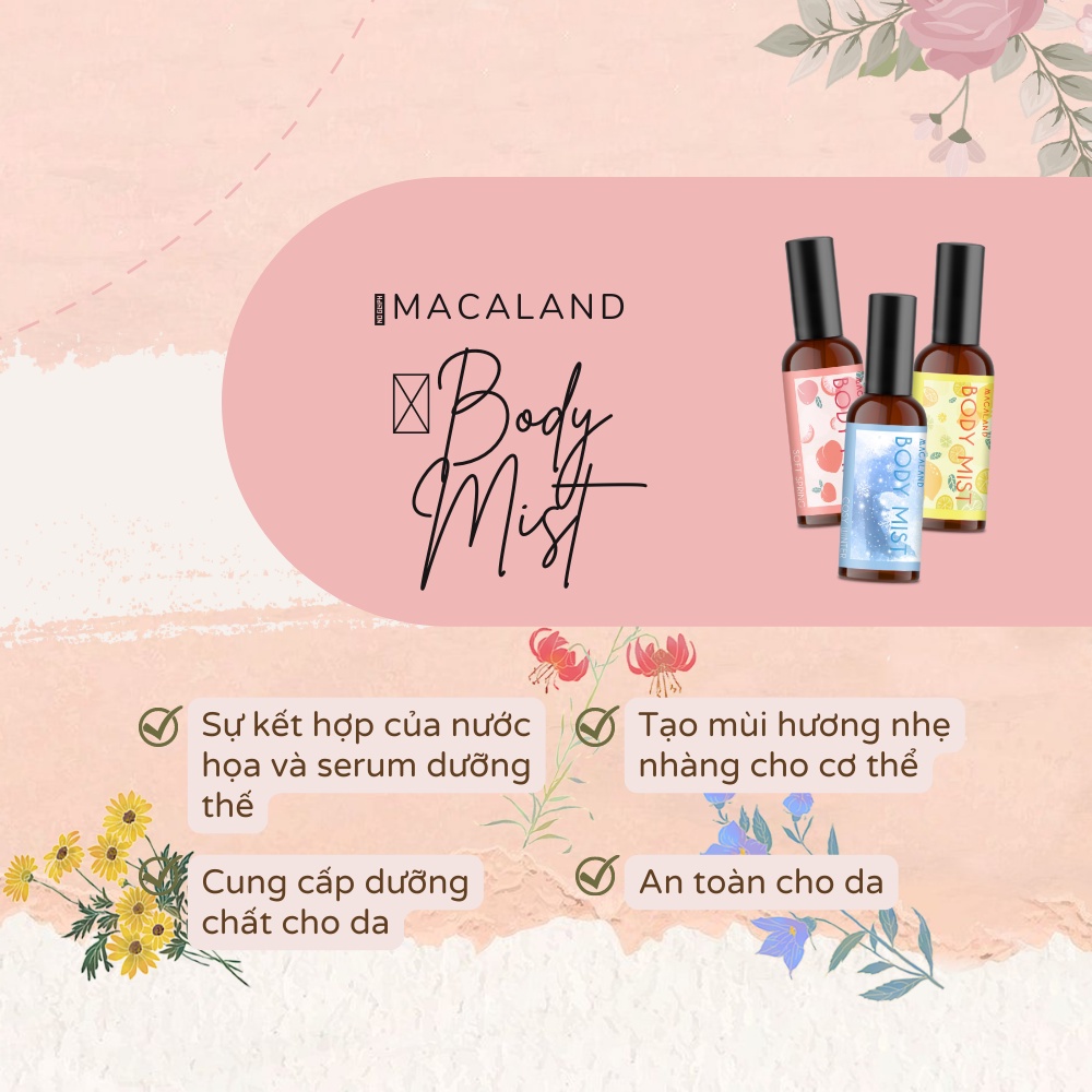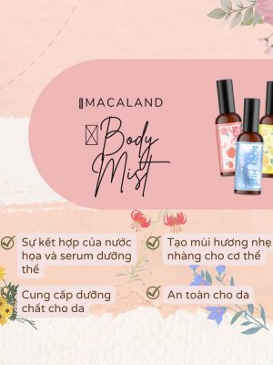 ♥️ Body Mist Macaland là loại xịt thơm toàn thân kết hợp giữa sản phẩm có công dụng dưỡng thể và tạo mùi hương như nước hoa. Nhờ sử dụng các thành phần dịu nhẹ, sản phẩm sẽ giúp làn da luôn mịn màng, mềm mại và thơm ngát cả ngày dài.