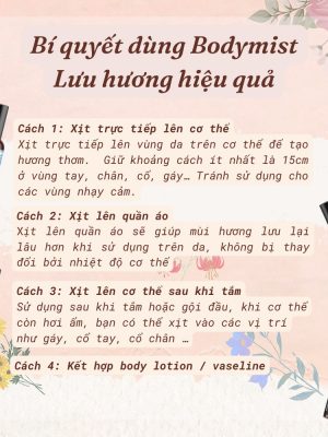 – Xịt vào body sau khi tắm: Sử dụng Body Mist đúng cách trên cơ thể sau khi tắm để giúp lưu hương được lâu hơn.
