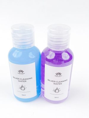 1. Đổ dung dịch nước rửa trang sức bạc ra cốc nhỏ và chuẩn bị thêm 1 khay nước sạch