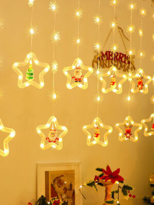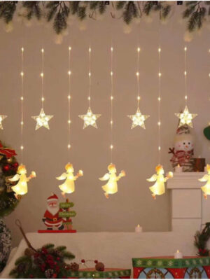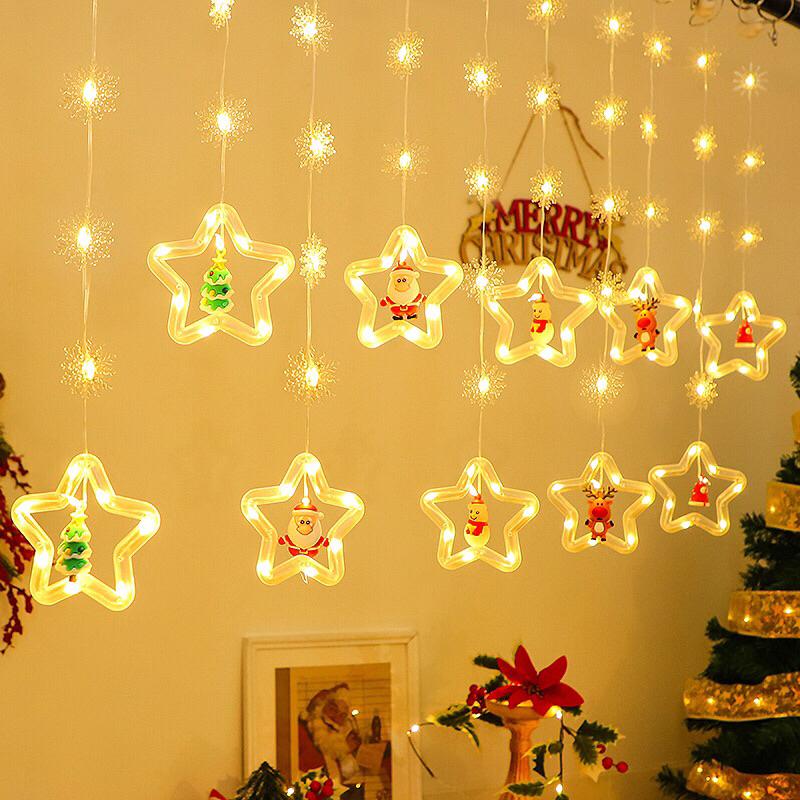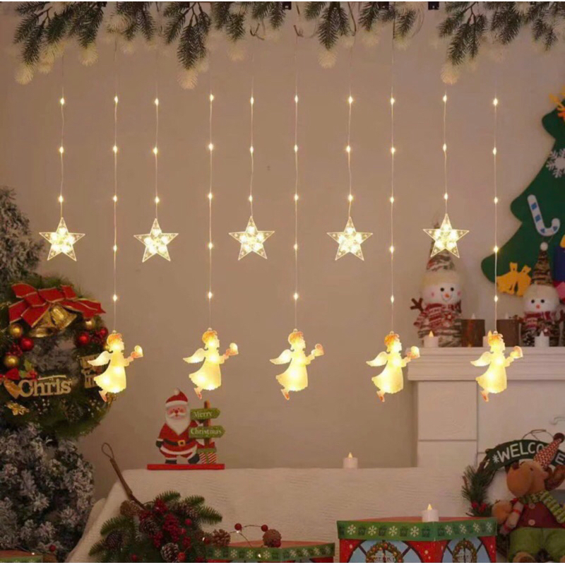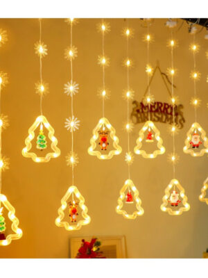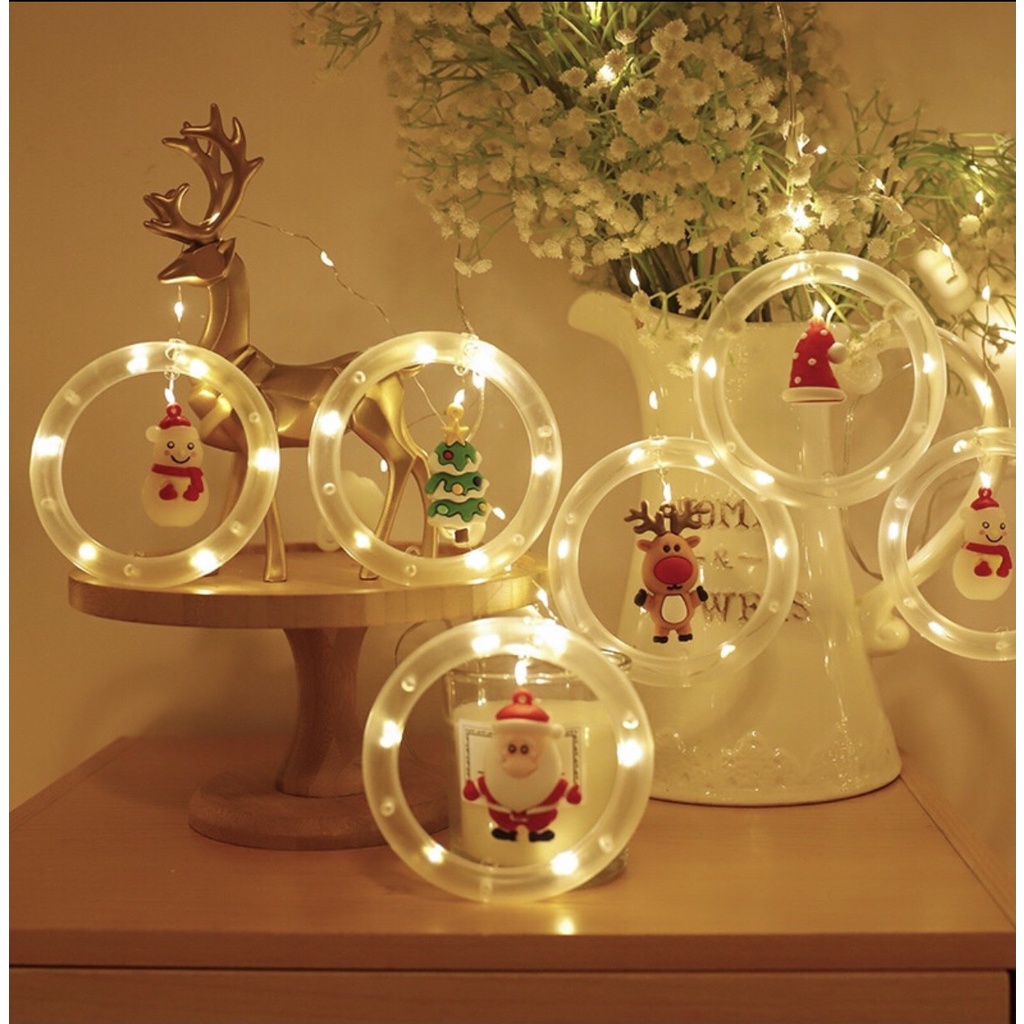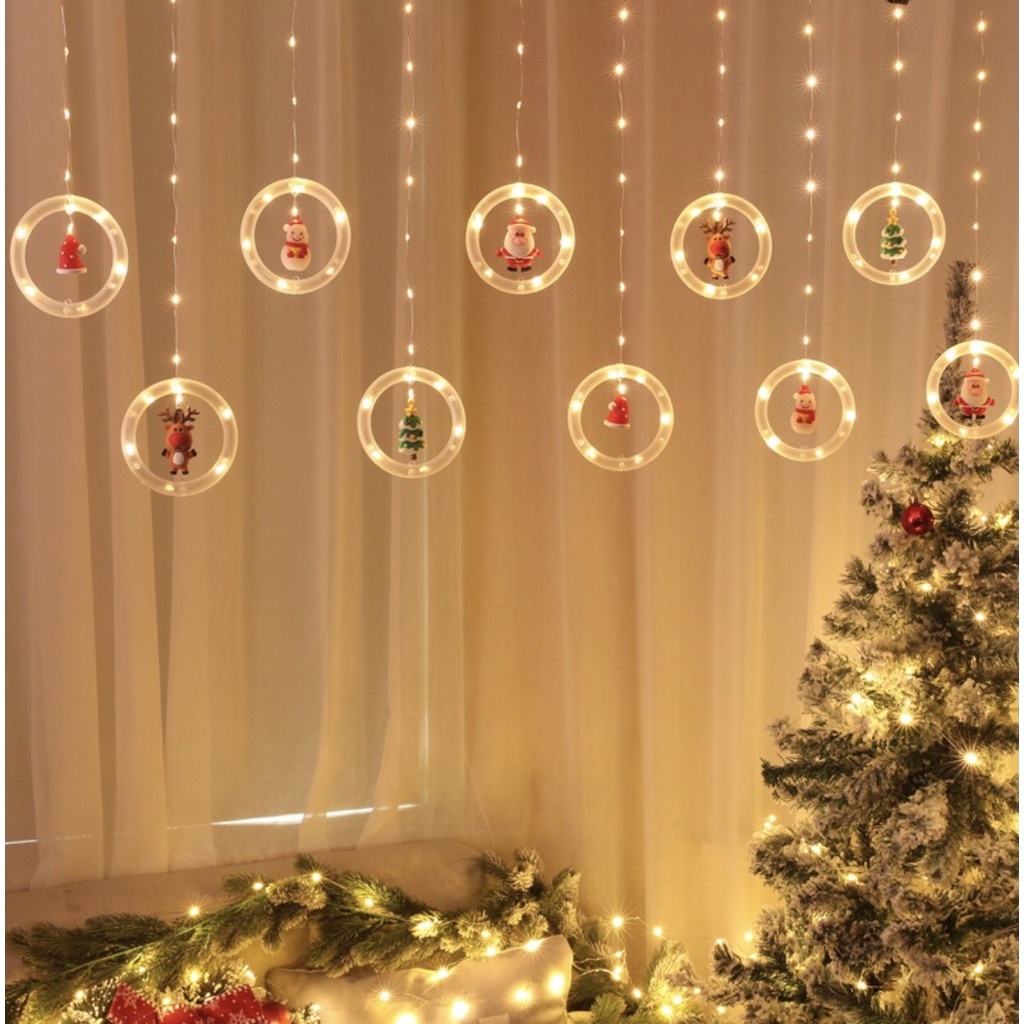 TÊN SẢN PHẨM: Đèn led trang trí thả mành kiểu vòng tròn ngang 3m gồm 10 vòng tròn có kèm búp bê noel