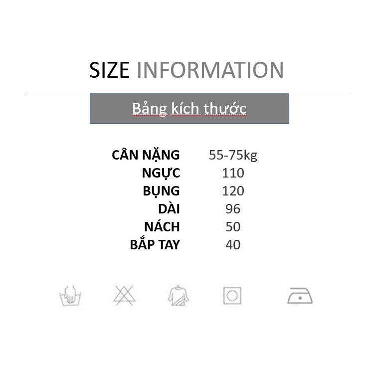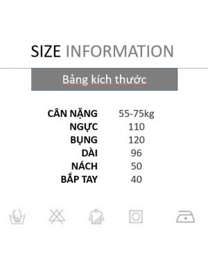 Kích cỡ: Size duy nhất: 55-75kg (80kg thì inb em tư vấn nhé ) Vòng ngực 110cm Vòng bụng: 120cm, Dài váy: 96cm Vai: 40cm, dài tay: 55cm. (Kích cỡ trên có thể chênh lệch vài cm do quá trình đo đạc và sản xuất)
