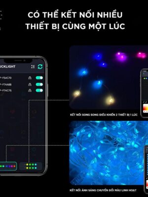 – Kết nối với điện thoại nhanh chóng, dễ dàng, chỉ cần dùng điện thoại quét mã QR trên dây đèn hoặc trong tờ hướng dẫn sử dụng để tải app về.