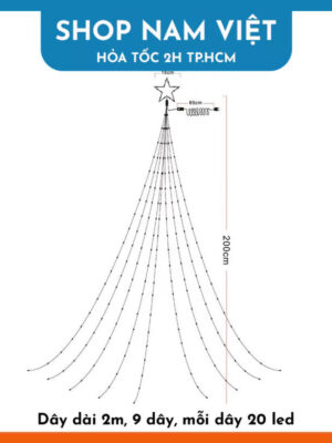 ➖ Đèn gồm một ngôi sao kim loại và 9 dây led thả xuống, thích hợp để trang trí ngoài trời hoặc quấn quanh cây thông trang trí Noel.