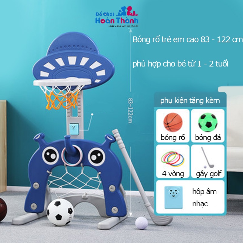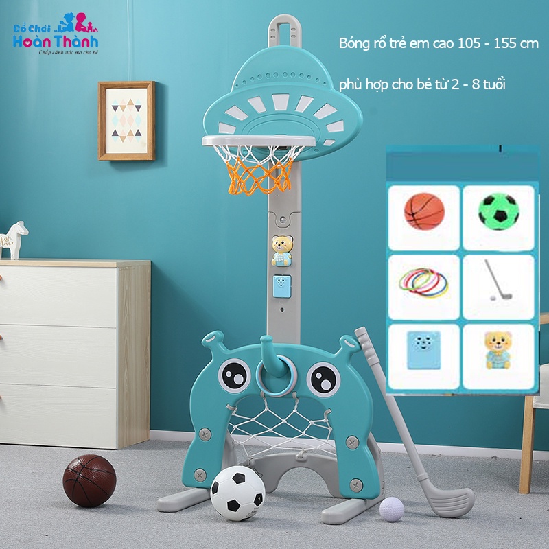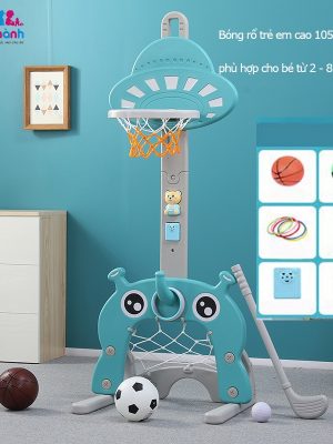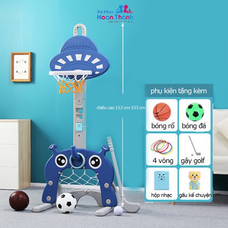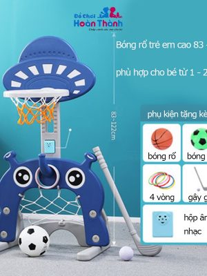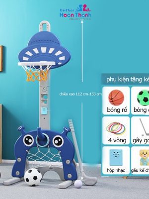 -Kích thước mẫu B màu xanh blue chiều cao 105 cm đến 155 cm. Có 1 bóng đá + 1 bóng rổ + 4 ném vòng + 1 golf + nhạc cảm biến + gấu kể chuyện phù hợp cho bé 2 – 6 tuổi