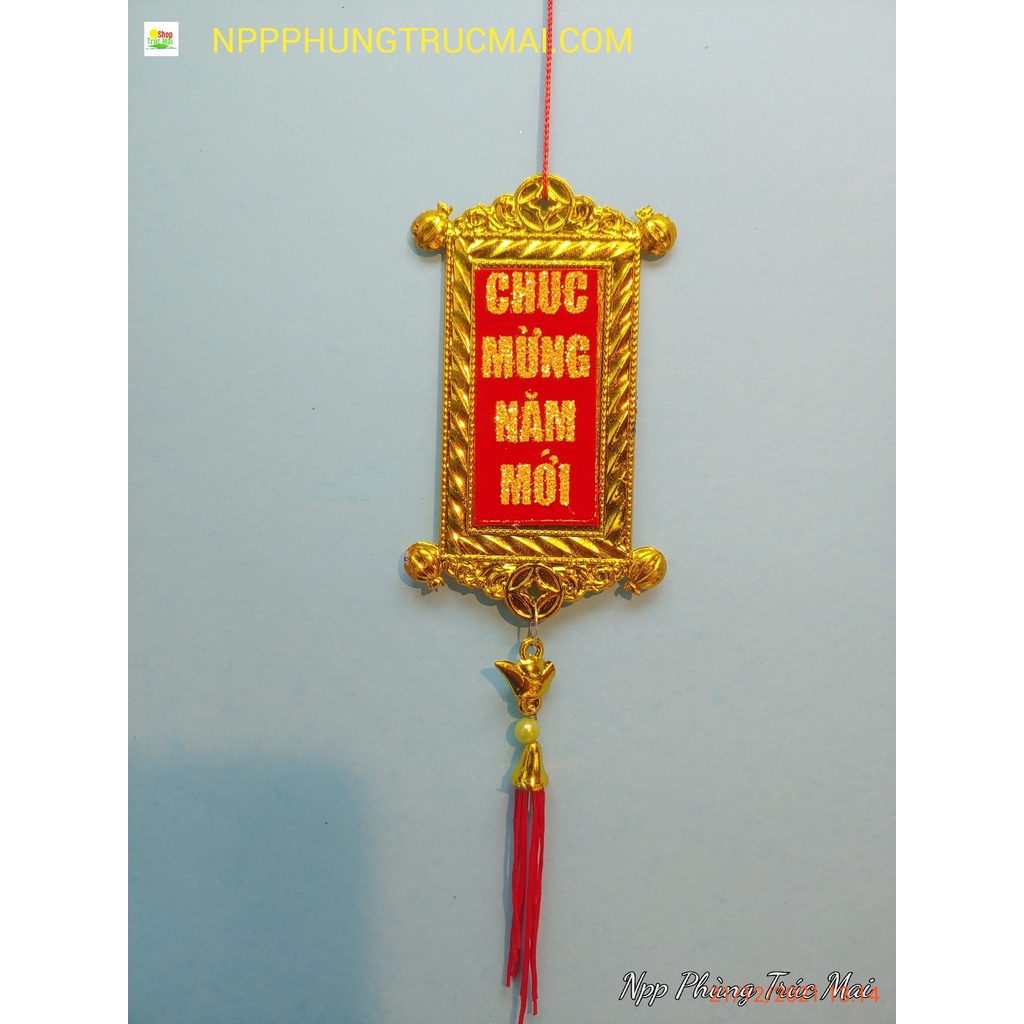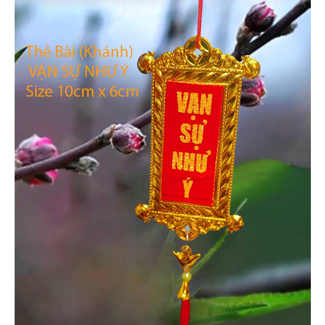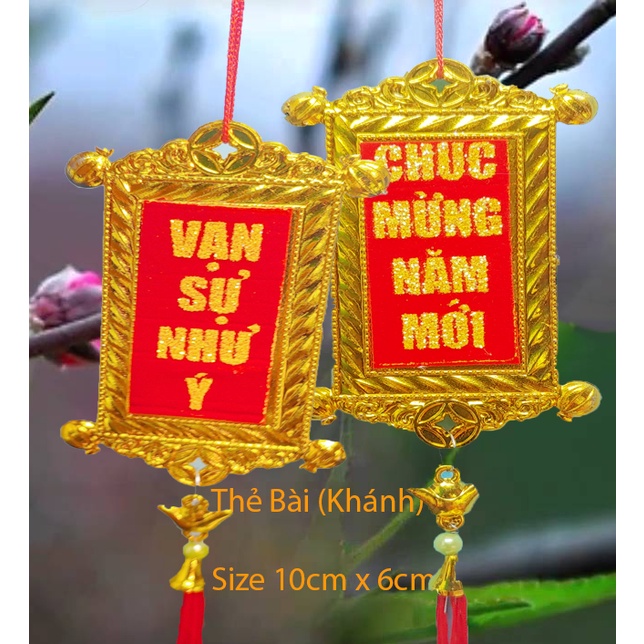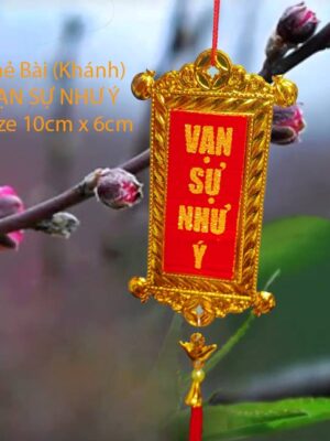 – Thẻ Bài Vàng nền đỏ Vạn sự như ý và chúc mừng năm mới với kích thước phong thủy 6cmx10cm