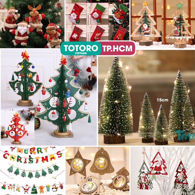 Đồ trang trí Giáng Sinh Noel để bàn – Cây Thông – Móc treo – Vớ tất – Quả cầu tuyết – Chuông gió – Dây đèn – Tranh vải