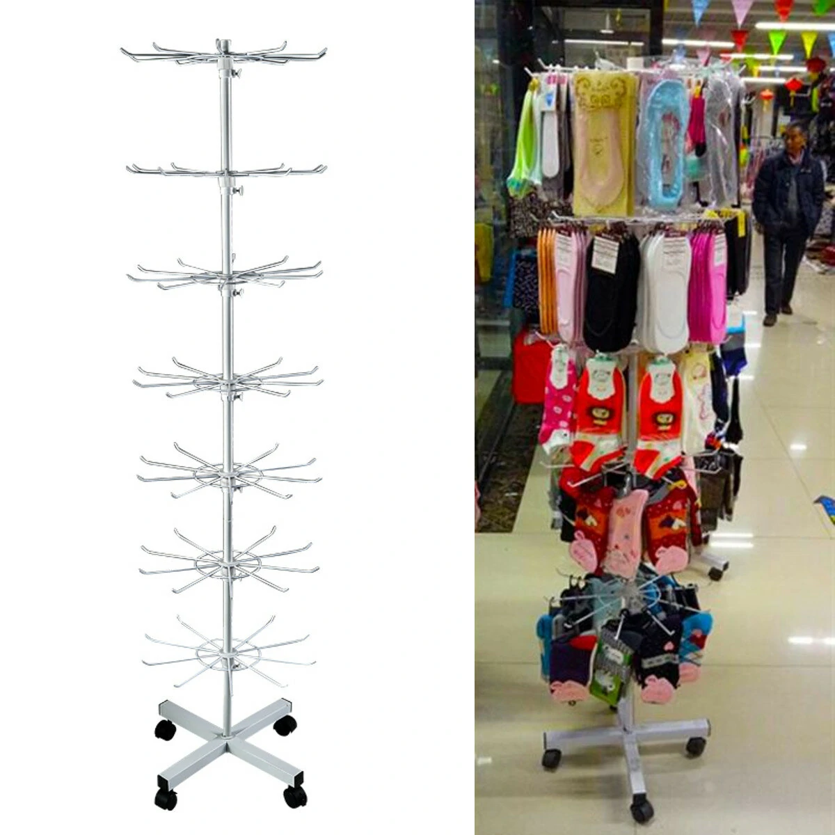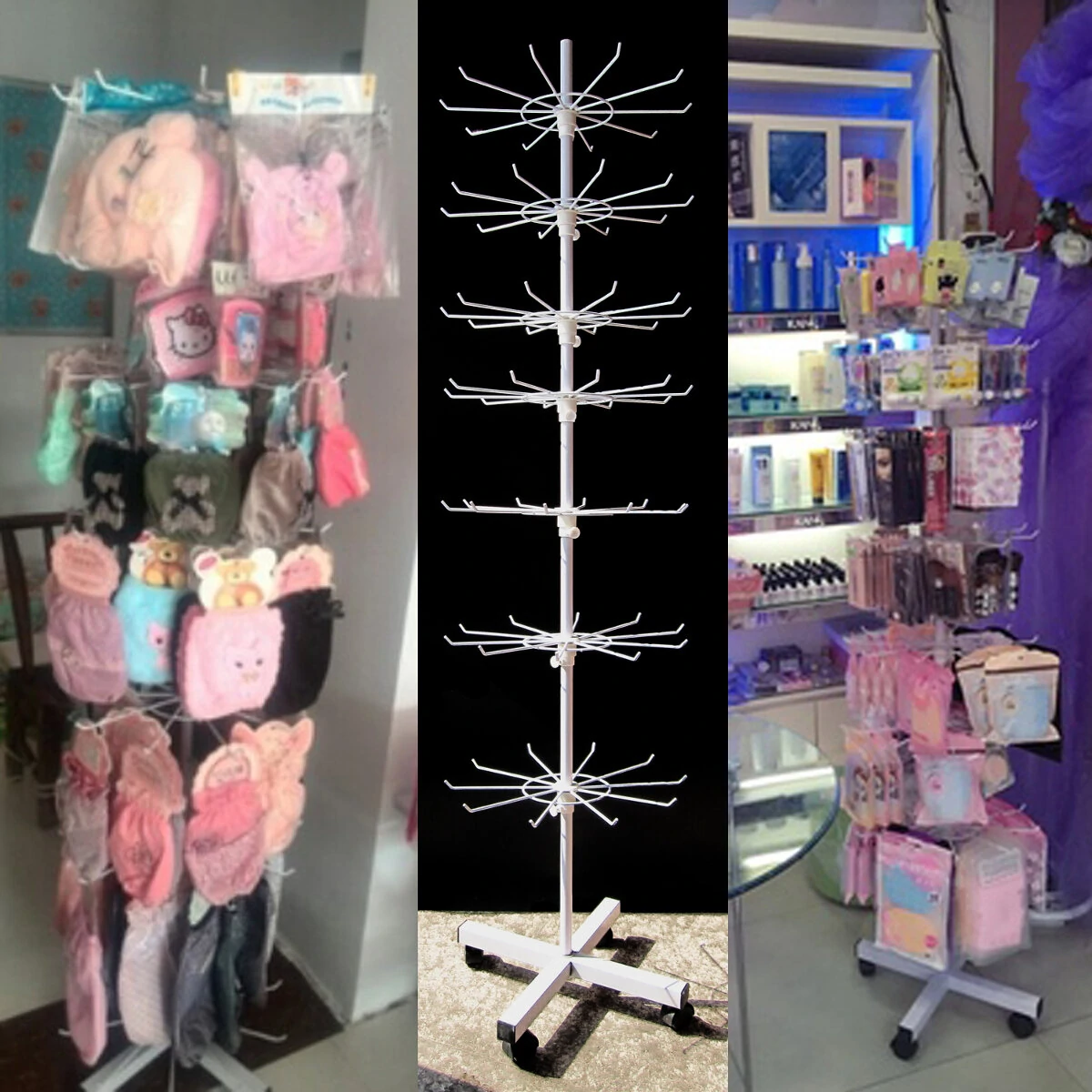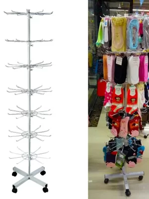 Giá xoay để trưng bày tất, đồ chơi, móc chìa khóa, túi nhỏ, mũ, khăn quàng cổ,… Nhẹ nhàng dễ dàng mang đi lắp ráp .