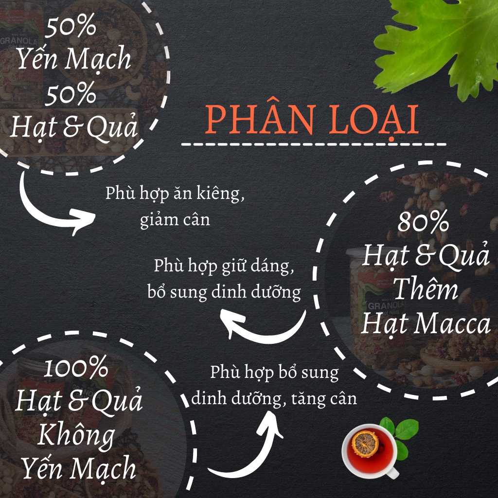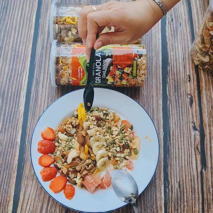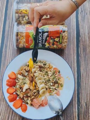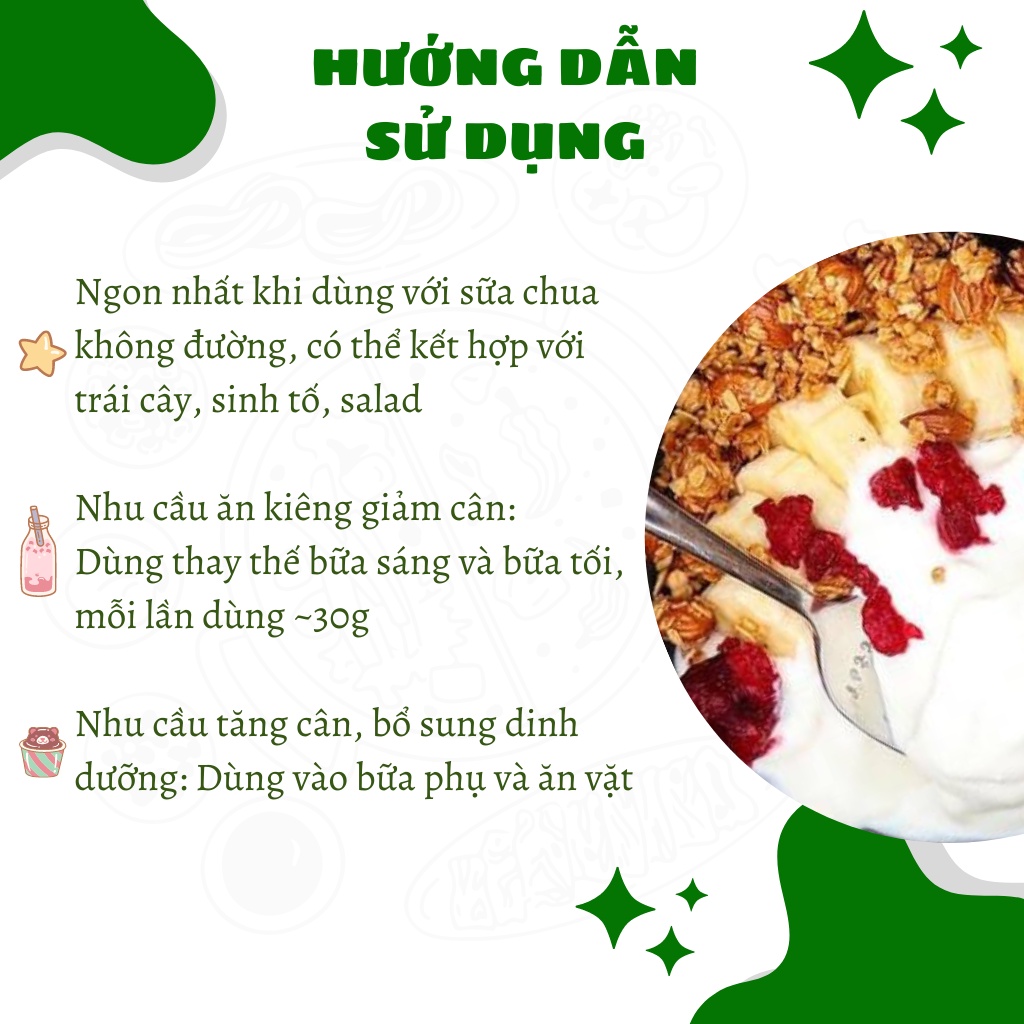 * Tip: Ngoài sử dụng trực tiếp, bạn có thể mix ngũ cốc giảm cân granola vị truyền thống hoặc vị socola cùng sữa chua không đường, sữa tươi & hoa quả, hương vị đa dạng và rất thơm ngon.