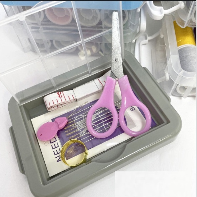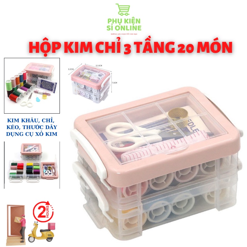 Hộp kim chỉ may vá đa năng gia đình 3 tấng 20 món mini, Bộ dụng cụ kim khâu, chỉ, kéo, thước dây, đồ xỏ kim tiện dụng