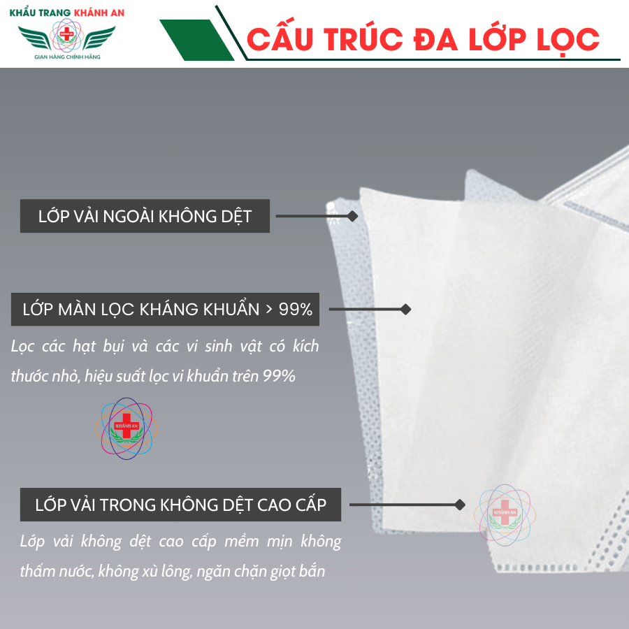 + Cấu tạo đa lớp giúp ngăn chặn khói bụi, vi khuẩn xâm nhập vào đường hô hấp, không gây dị ứng.