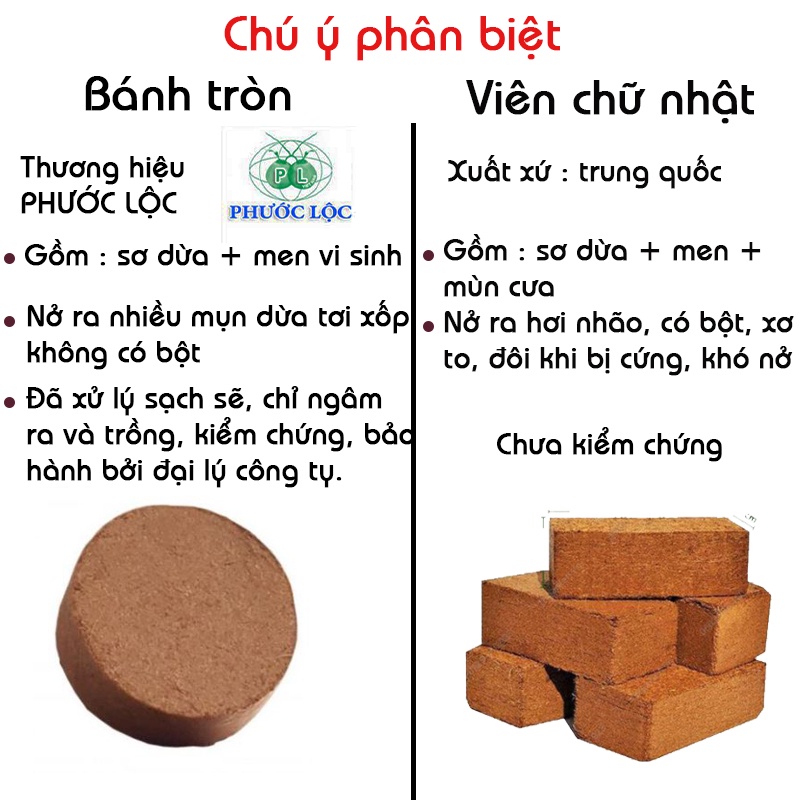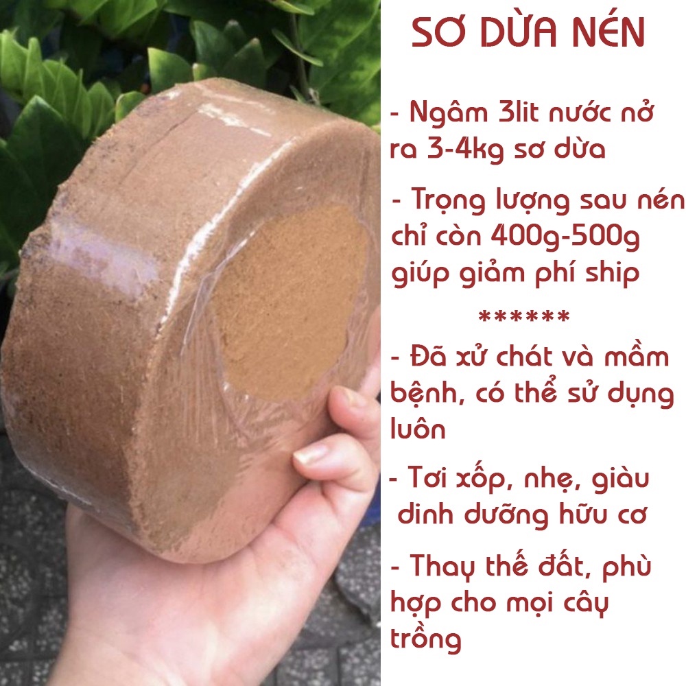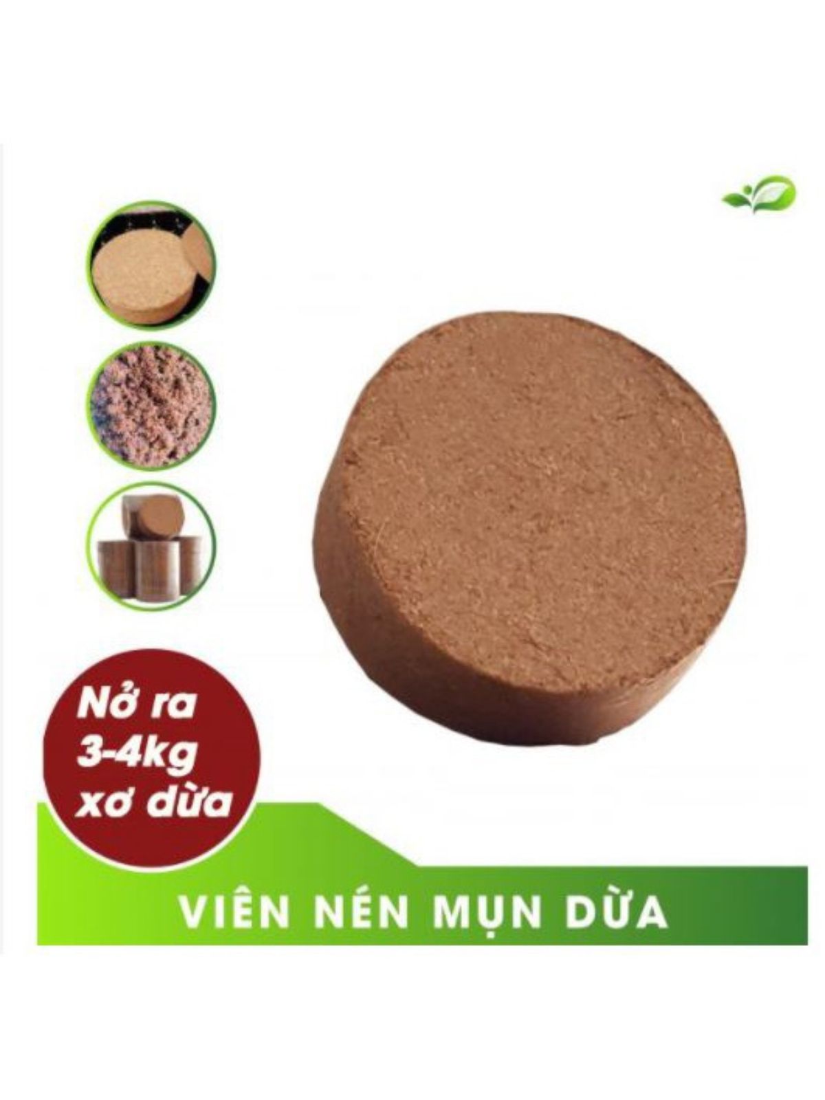 1 viên ngâm vào nước sẽ nở gấp 5 lần. Cho bạn 5 dm3 (Khoảng 4-5 k) giá thể mụn dừa sạch trồng cây