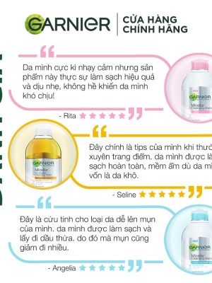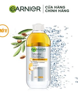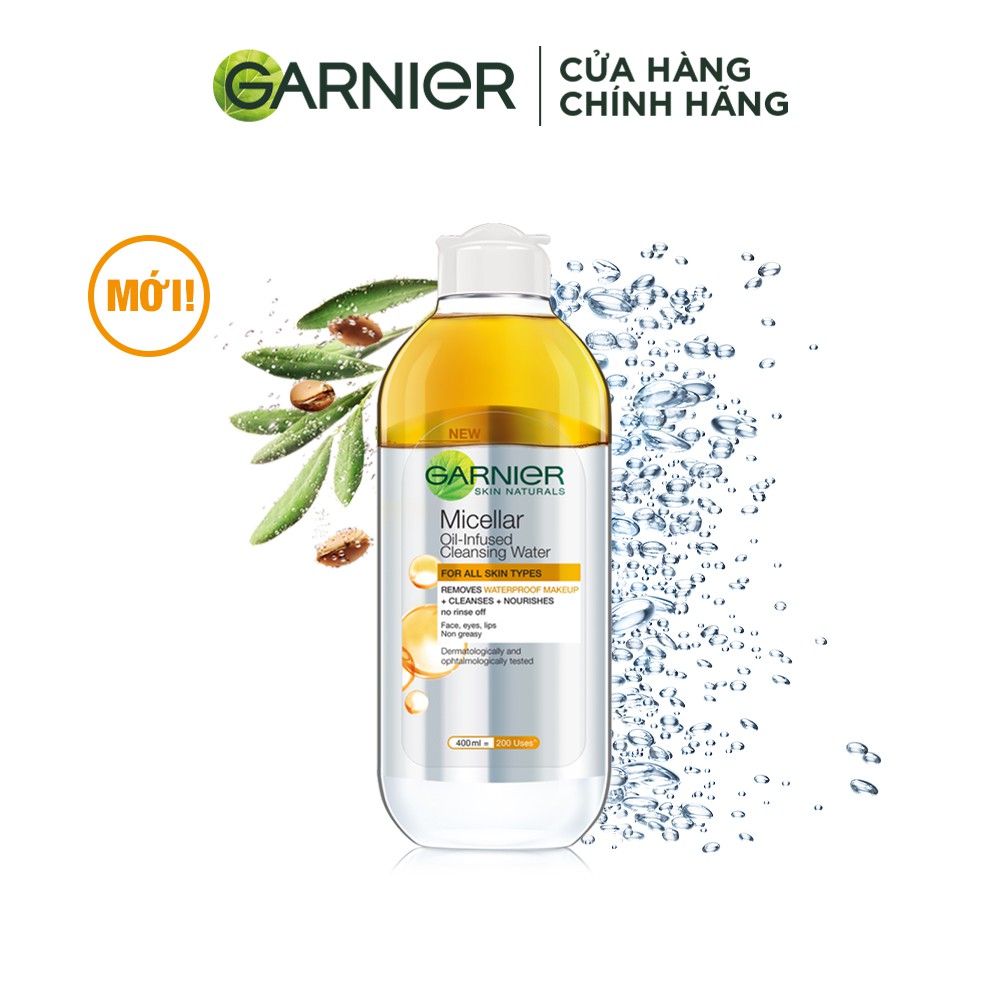 – Dành cho da khô & trang điểm. Nước làm sạch và tẩy trang đa năng Garnier Micellar Water Oil-Infused 400ml an toàn cho da nhạy cảm. Không chứa cồn, không gây kích ứng da. Kết cấu không nhờn, không bết dính, phù hợp với mọi loại da. Sử dụng công nghệ Micelles (Micellar Technology) kết hợp Dầu hạt Argan thiên nhiên có tác dụng dưỡng ẩm cho da. Phân tử Micelles lấy đi bụi bẩn sâu bên trong lỗ chân lông theo cơ chế hoạt động của nam châm, dầu hạt Argan lấy đi cặn bẩn trang điểm và dưỡng ẩm da.