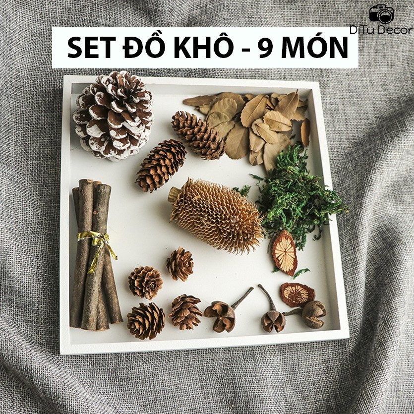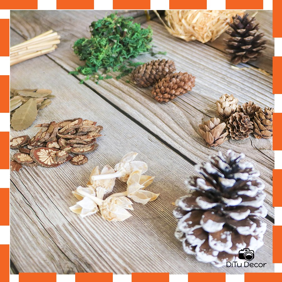 – Sản phẩm được gom trong 1 bọc chứa các loại phụ kiện khác nhau như: Các loại hạt thông, Lá khô, Rêu khô, Cây khô,… các bạn xem ảnh và video để rõ 1 set gồm những gì số lượng như nào nhé