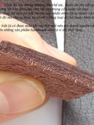 – Da bò nguyên miếng : dài 120 cm; rộng 3,3 cm; độ dày 0,3. Được làm từ lớp da bò chọn lọc hoàn toàn thủ công bởi những người thợ lành nghề. Giữ lại được vẻ đẹp tự nhiên, độ bền theo năm tháng.